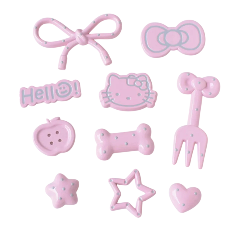 Tato sada dekorací na crocsy obsahuje 10 ks ozdob, které zaujmou různými tvary a sladěným barevným provedením. Na obrázku jsou dobře viditelné rozmanité motivy, mezi nimi mašličky, stylizovaná hlavička kočky, kost, hvězdičky, srdce, nápis a další drobné prvky. Celek působí sjednoceně díky jemné růžové barvě, která se opakuje na všech ozdobách. Sada je vhodná pro ty, kdo chtějí obuv jednoduše doplnit o hravé a dobře rozlišitelné detaily. Různé motivy navíc umožňují vytvářet více kombinací podle vlastního stylu.