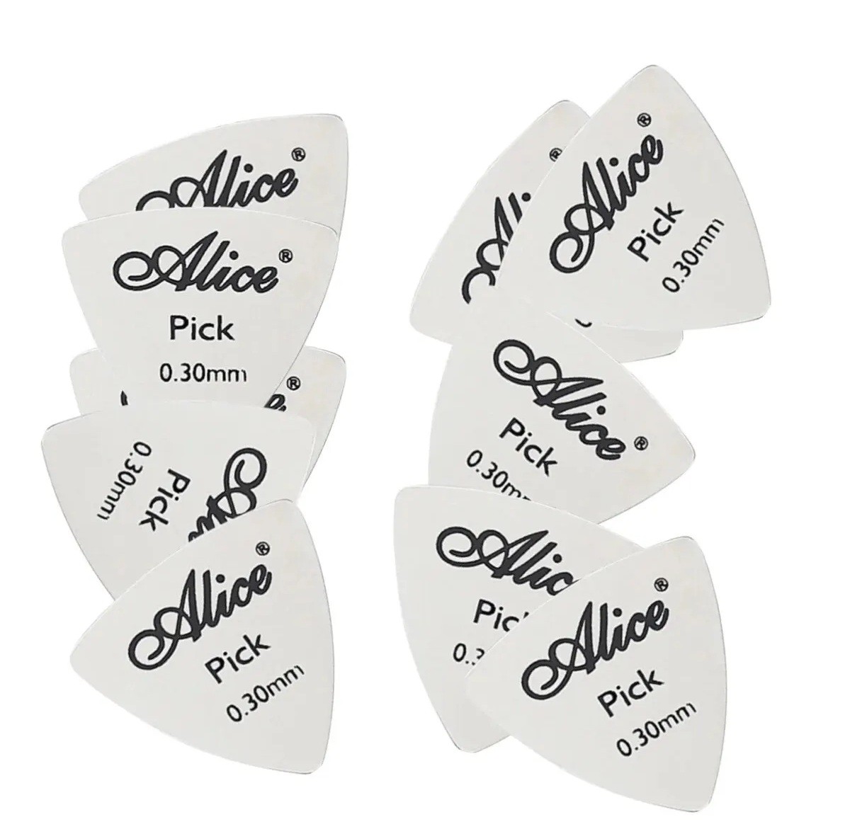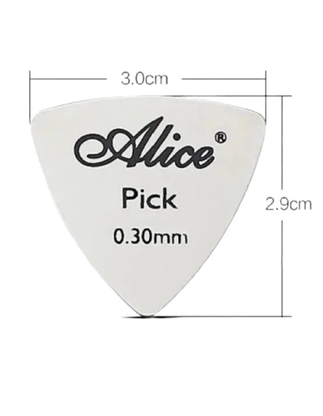 10 ks Kovová trsátka Alice 0.3 mm Trojúhelníkový tvar Nerezová ocel Lesklý povrch Odolná trsátka pro elektrickou i akustickou kytaru Precizní tón