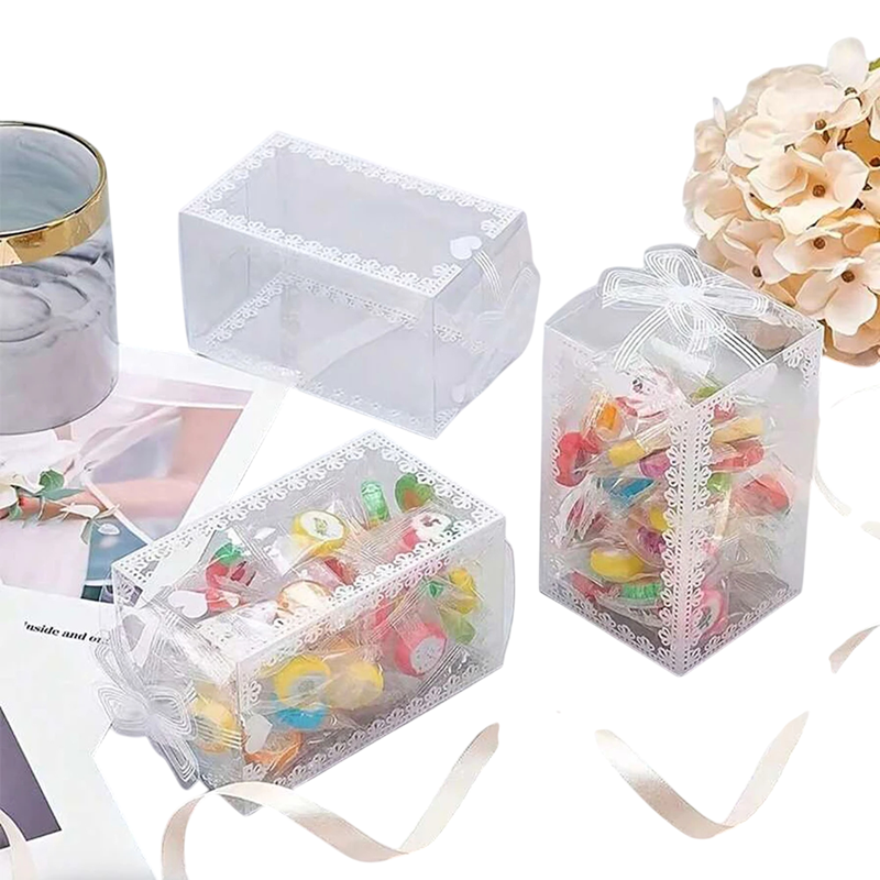 10 ks Průhledné PVC krabičky 10,5 x 6 x 6 cm Plastové dárkové boxy s mašlí a srdíčky Svatební výslužky Vánoční balení cukrovinek Elegantní dekorativní obaly