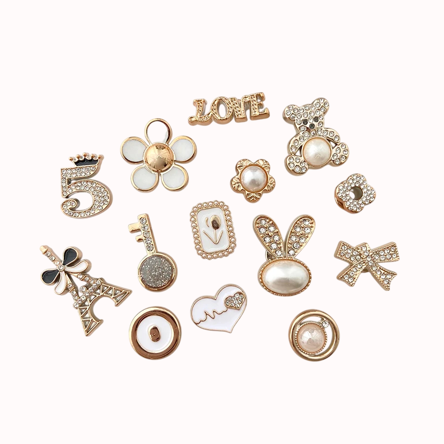 Sada dekorací na crocsy nabízí jednoduchý způsob, jak upravit vzhled obuvi podle vlastního stylu. Tento set obsahuje více různých motivů, které kombinují jemné tvary s lesklými detaily. Díky zlatému provedení s kamínky působí ozdoby výrazně a dobře vyniknou na každém páru nazouváků. Různorodost motivů umožňuje kombinovat jednotlivé prvky podle aktuální nálady.