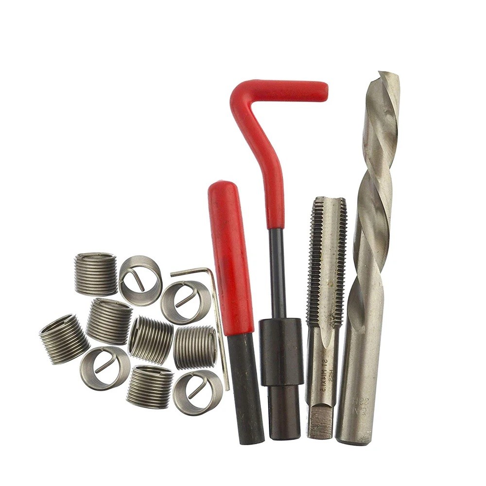 Součástí balení je vrták, závitník a instalační nástroje, které umožňují provést celý proces opravy krok za krokem. Nejprve se upraví otvor pomocí vrtáku, následně se závitníkem vytvoří nový závit a poté se vloží závitová vložka. Ta slouží k obnovení funkčního závitu a umožňuje jeho další používání. Tento postup pomáhá zachovat původní rozměr závitu a obnovit jeho funkčnost.