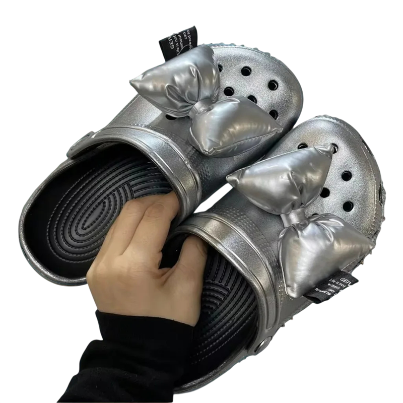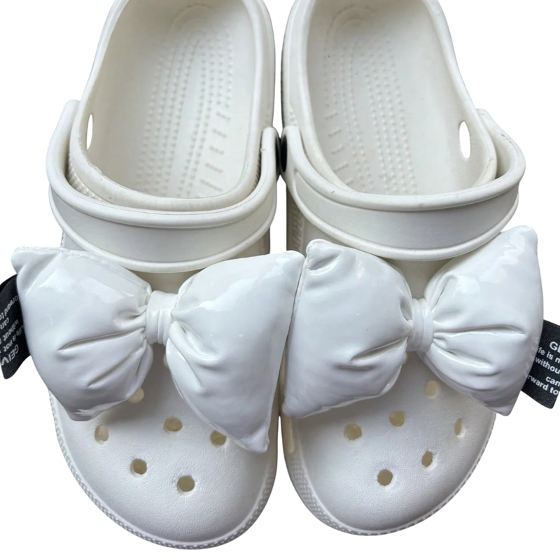 Dekorace na crocsy ve tvaru mašliček jsou praktickým doplňkem, který umožňuje snadno upravit vzhled nazouvací obuvi. Tyto ozdoby jsou navrženy pro použití na crocsy a podobné typy bot s otvory, kam lze dekoraci jednoduše připevnit. Díky svému tvaru mašličky vytvářejí výrazný detail, který je na obuvi dobře viditelný. Lesklé provedení povrchu dodává ozdobám zajímavý vzhled bez nutnosti dalších úprav. Materiál PU kůže je lehký a vhodný pro každodenní použití.