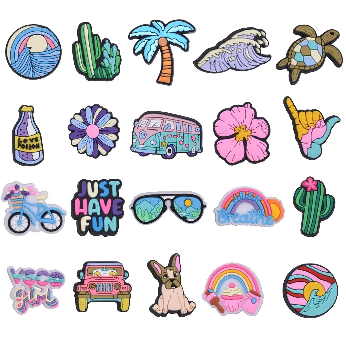 20 ks dekorace na crocsy barevné motivy PVC sada ozdob do nazouvací obuvi doplňky do otvorů bot různorodé tvary