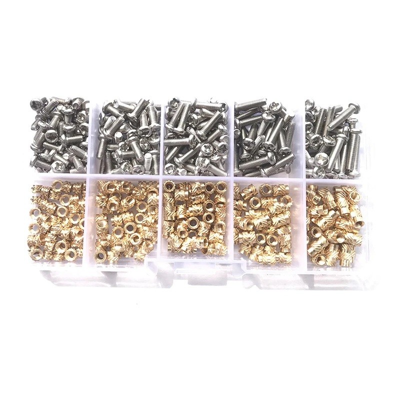 Šrouby mají stříbrné provedení, zatímco matice jsou v zlaté barvě, což umožňuje snadné vizuální rozlišení jednotlivých prvků. Každý typ je uložen v samostatné přihrádce, což usnadňuje orientaci a zrychluje práci bez nutnosti třídění.