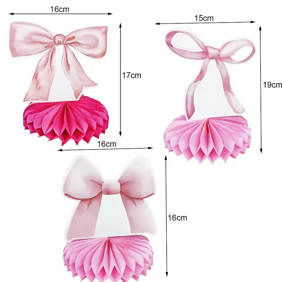 Papírové závěsné party dekorace honeycomb s motivem mašle jsou stylovým doplňkem každé narozeninové oslavy, baby shower nebo dětské party. Elegantní růžový design působí jemně a slavnostně, takže se skvěle hodí do tematických dekorací pro dívčí oslavy nebo romantické party výzdoby. Kombinace dekorativní mašle a papírového vějíře vytváří atraktivní prostorovou dekoraci.