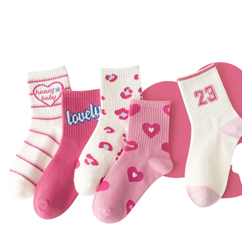 5 párů Dívčí dětské ponožky Bavlna polyester elastan Růžové ponožky se vzory Pohodlné měkké dětské ponožky pro každodenní nošení