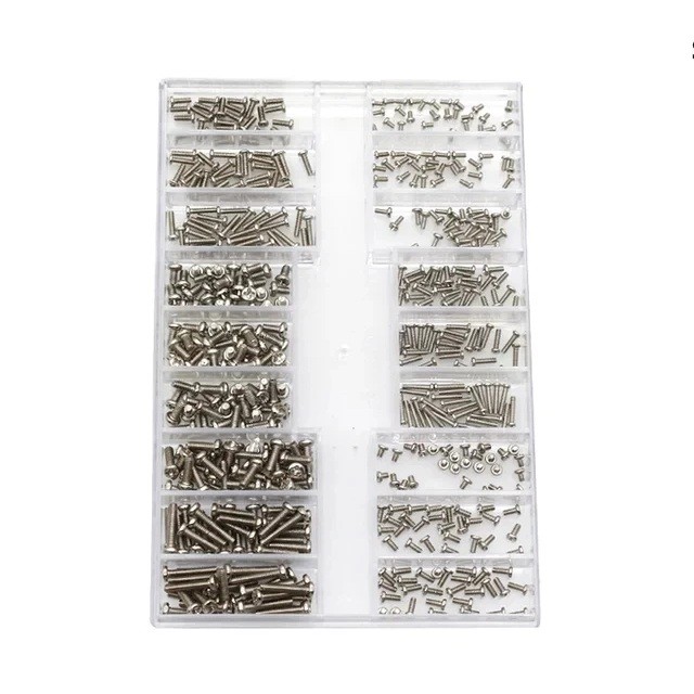 Tato sada mini šroubků je určena pro jemné opravy elektroniky a drobných zařízení. Obsahuje 500 ks šroubků, které jsou přehledně uspořádány v plastovém organizéru. Na obrázku je uvedeno označení stainless round head screws, což znamená, že šroubky mají kulatou hlavu a stříbrné provedení. Díky malým rozměrům jsou ideální pro opravy notebooků, mobilních telefonů nebo brýlí.
