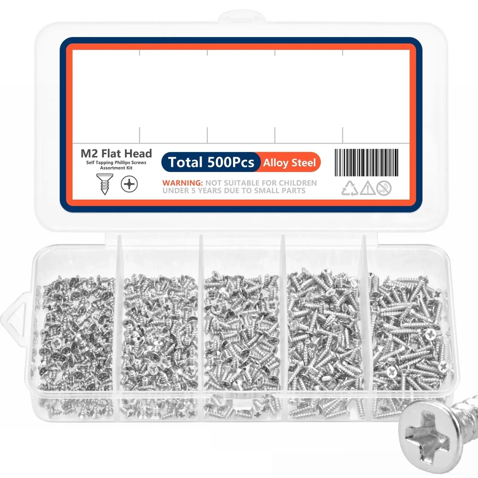 500 ks samořezné šrouby M2 s plochou hlavou sada 5 velikostí legovaná ocel stříbrná barva pro drobné montážní práce