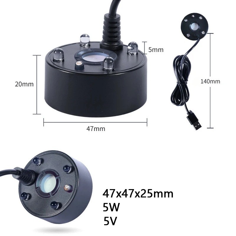 5V USB atomizér pro vodní fontánu, rybníkový rozprašovač pro akvária a terária s 4 LED barevnými světly Tento 5V USB atomizér je ideální pro použití v akváriích, rybnících a teráriích. S výstupem jemné mlhy vytváří příjemnou atmosféru a zlepšuje vlhkost prostředí pro zvířata a rostliny. Je vybaven 4 barevnými LED světly, která mění barvy a přidávají do vašeho prostoru dekorativní efekt. Atomizér má kompaktní rozměry a je vybaven USB portem pro snadné napájení. Tento atomizér využívá moderní ultrazvukovou technologii pro efektivní rozptyl vody, která se rychle mění v jemnou mlhu. Lze jej použít v různých prostředích, od dekorativních fontán po zlepšení vlhkosti v teráriích. Tento produkt má také ochranu proti nedostatku vody, což zajišťuje bezpečnost při použití.
