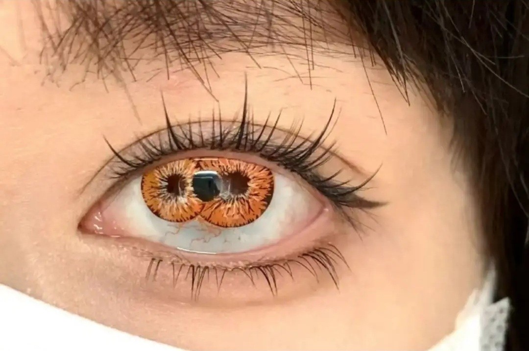 Barevné kontaktní čočky s výrazným motivem zaujmou netradiční kresbou duhovky a neobvyklým uspořádáním tmavých prvků. Design je tvořen světlejším podkladem doplněným o nepravidelné tmavé kruhy, které vytvářejí efekt roztrojené zornice. Tento vizuální prvek působí výrazně a mění celkový vzhled oka.