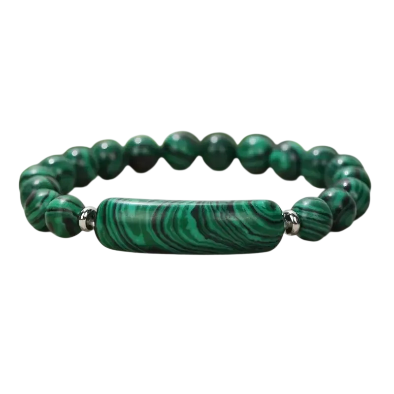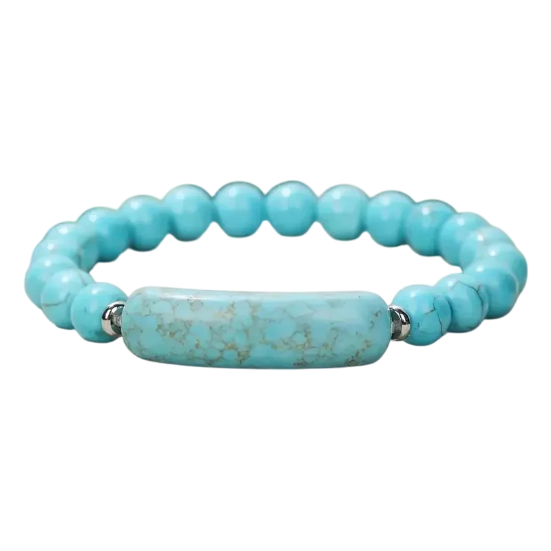 Barevné náramky z přírodních kamenů kombinují kulaté korálky s výraznějším středovým prvkem, který dodává celku zajímavý vzhled. Korálky o velikosti přibližně 8 mm vytvářejí pravidelný tvar a pohodlně sedí na zápěstí. Středová část je doplněna hladkým podlouhlým kamenem, který působí jako hlavní dekorativní prvek.