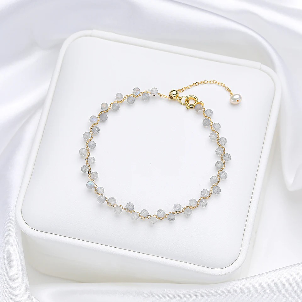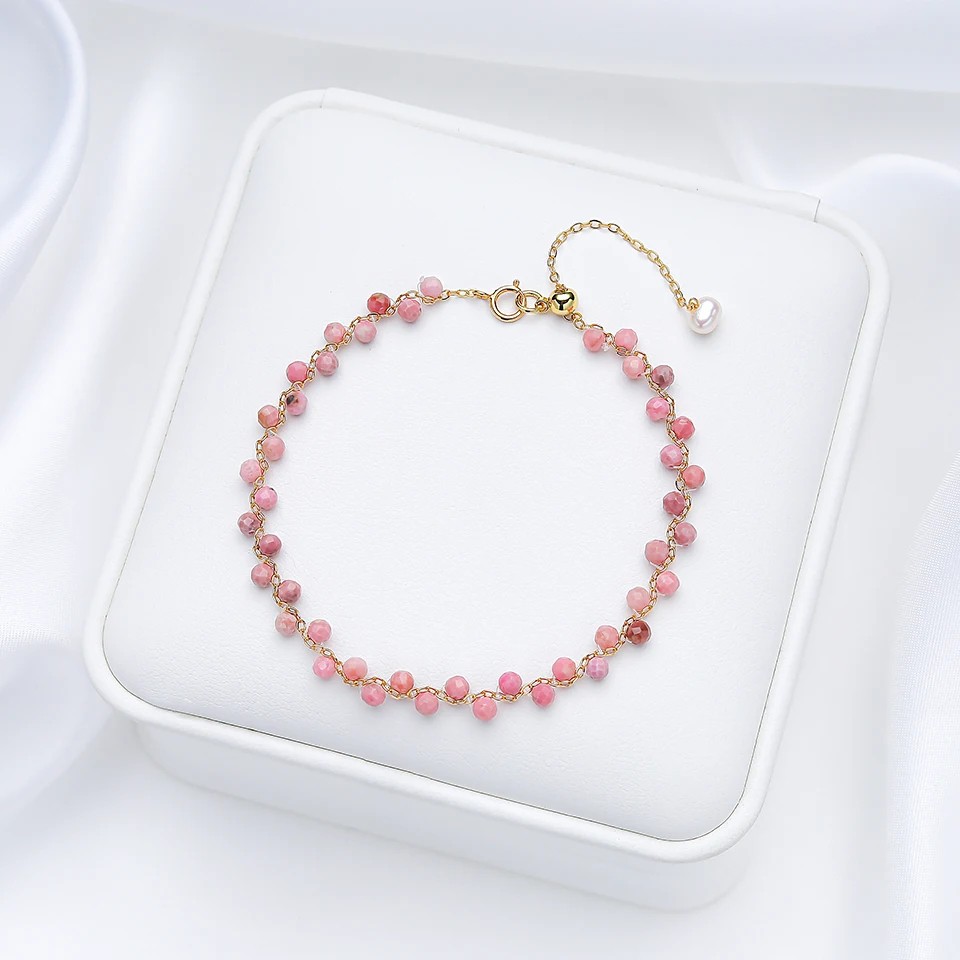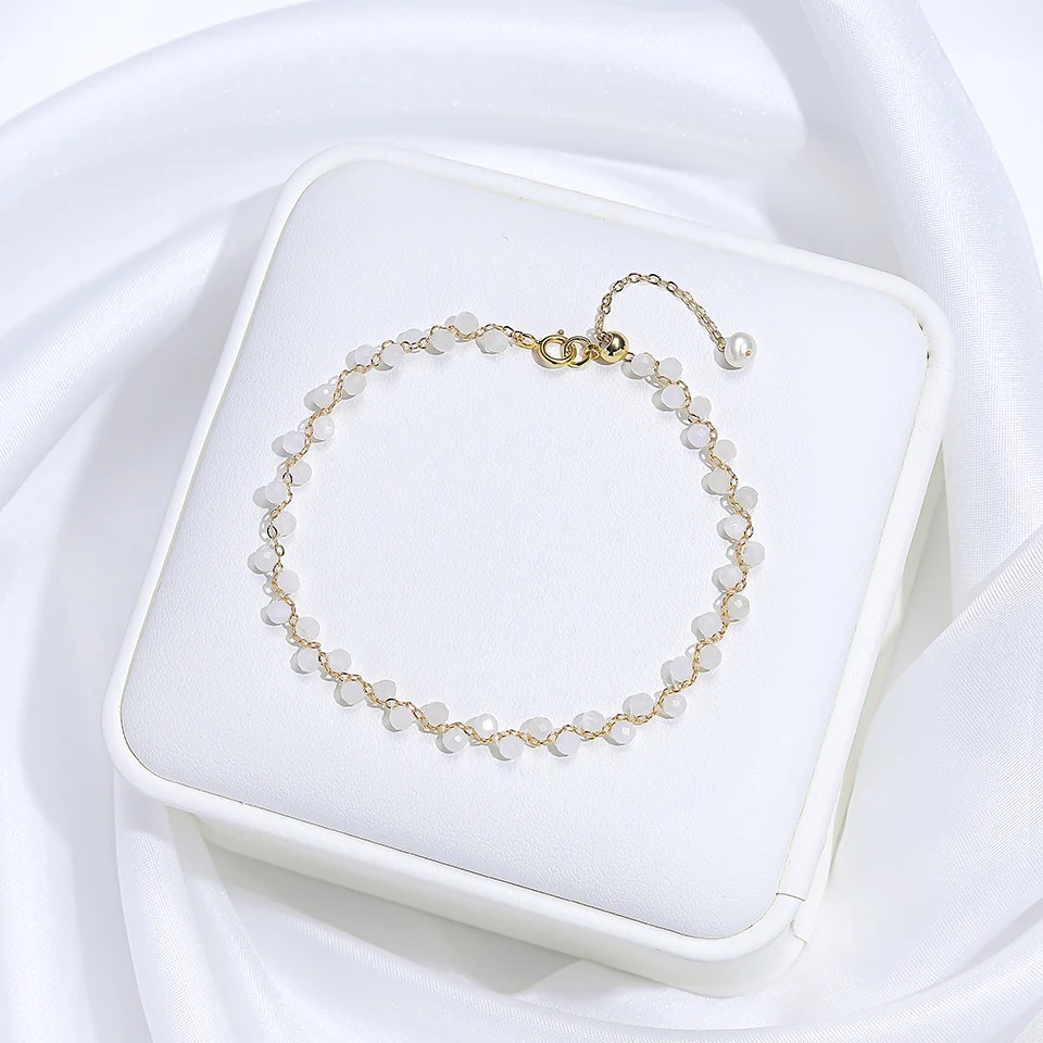 Tento náramek je vhodný jako jemný doplněk pro různé příležitosti. Díky nastavitelnému zapínání se snadno přizpůsobí velikosti zápěstí. Kombinace drobných kamínků a perličky vytváří vyvážený vzhled. Řetízek dodává celku elegantní charakter. Lehké provedení zajišťuje pohodlné nošení během dne.