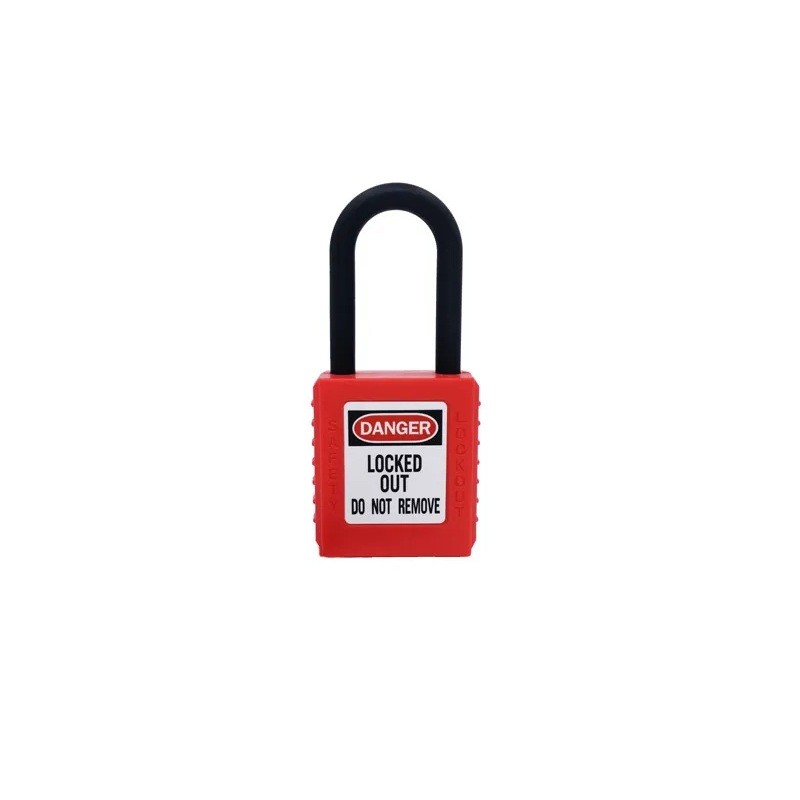 Tělo zámku je vyrobeno z ABS plastu, který zajišťuje nízkou hmotnost a snadnou manipulaci. Pevný třmen umožňuje bezpečné uzamčení na různých typech otvorů nebo úchytů. Na přední straně je viditelné označení, které upozorňuje na uzamčený stav.