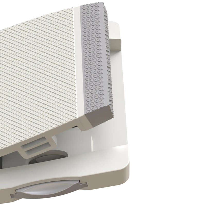 Mechanismus funguje na principu přítlaku, kdy se pohyblivá část opírá o rám a brání otevření. Konstrukce je tvořena jedním hlavním tělem a pohyblivou částí, která se přizpůsobuje povrchu. Výška mechanismu je přibližně 3 cm a spodní část má tloušťku kolem 1 cm, což přispívá ke stabilnímu uchycení. Na fotografiích je také patrné, že produkt je určen pro instalaci na dveře nebo okna bez složité montáže.