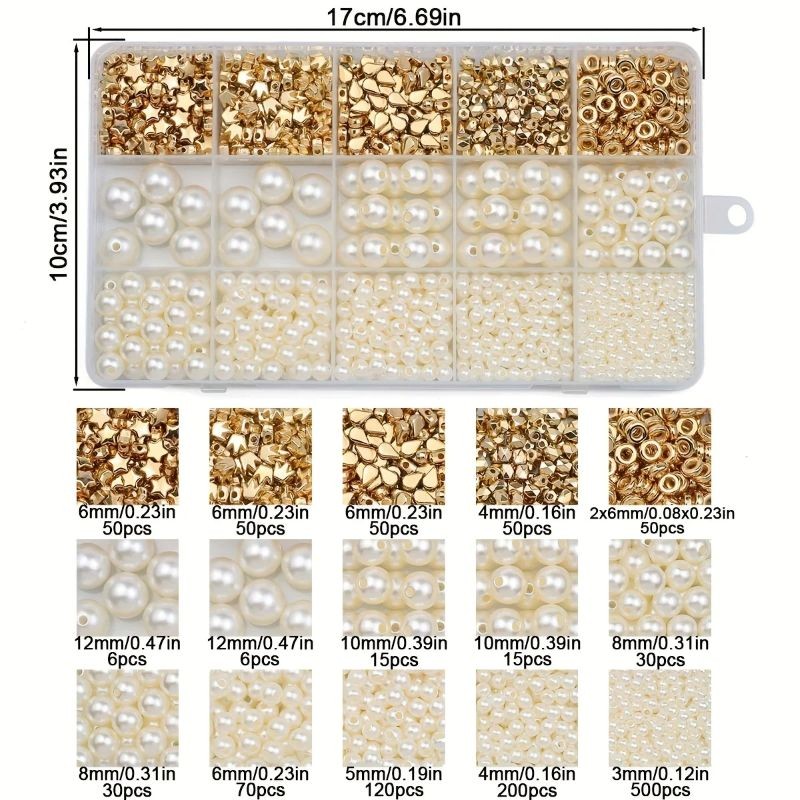 Box 10 x 17 cm Sada akrylových zlatých a perleťových korálků 1240 ks Různé tvary a velikosti Korálky pro výrobu šperků náramků náhrdelníků