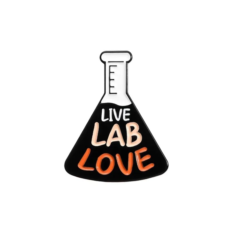 Brož Live Lab Love laboratorní baňka cca 3 x 2,3 cm kovový odznak černý s bílým a oranžovým nápisem na oblečení batoh tašku