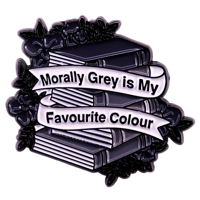 Kovová brož zobrazuje několik naskládaných knih doplněných páskou s textem „Morally Grey is My Favourite Colour“. Design využívá tmavé černé a šedé odstíny, které vytvářejí kontrastní a výrazný vzhled. Kolem knih jsou umístěny stylizované listy, které doplňují celkový motiv. Jednoduché linie a přehledné rozvržení zajišťují dobrou čitelnost textu i tvarů.