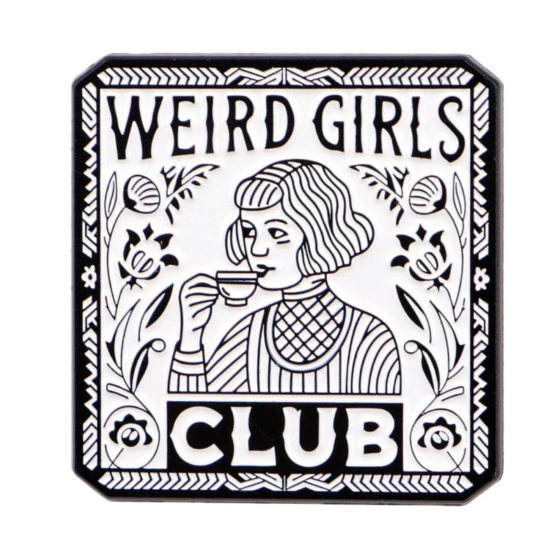 Klopová brož s nápisem Weird Girls Club zaujme svým kontrastním černo-bílým designem a ilustrací postavy s šálkem. Motiv je doplněn dekorativními prvky a rámečkem, které dodávají celému odznaku charakteristický vzhled. Díky svému provedení se hodí jako doplněk na oblečení, batoh nebo klopu kabátu a snadno oživí každodenní outfit.