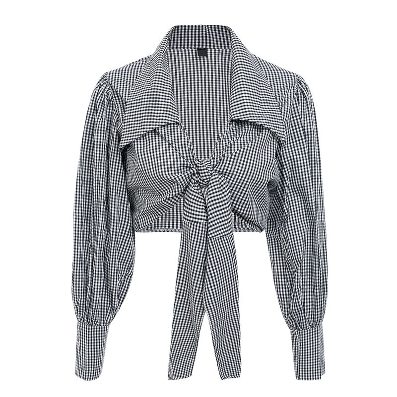 Kostkovaný vzor a módní vázání uprostřed prsou.