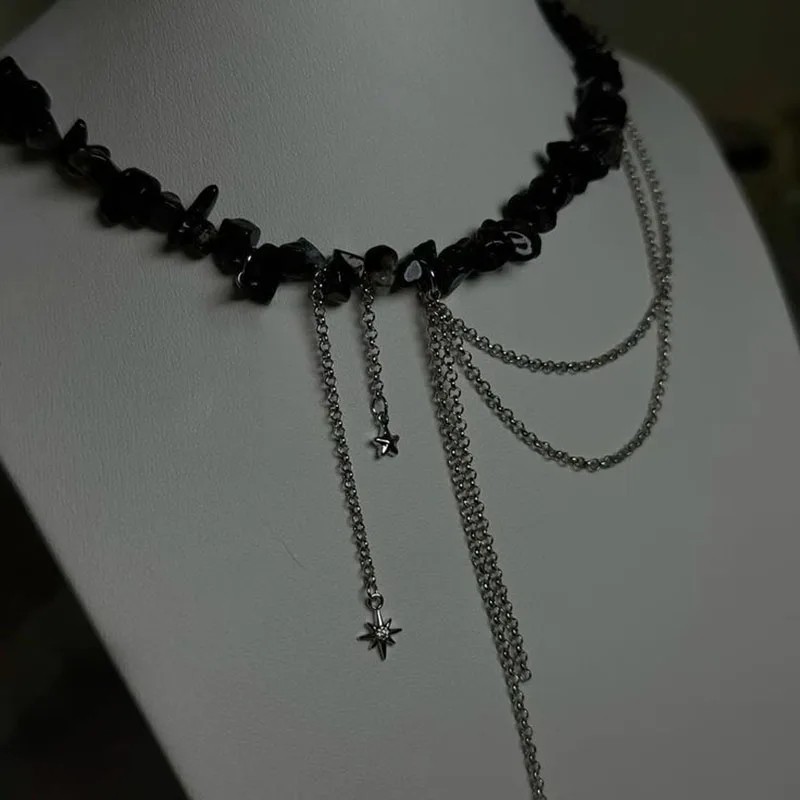 Černý náhrdelník z nepravidelných kamínků doplněný více řetízky, hvězdou a drobným křížkem, působí výrazně, goticky a originálně. Celý popis