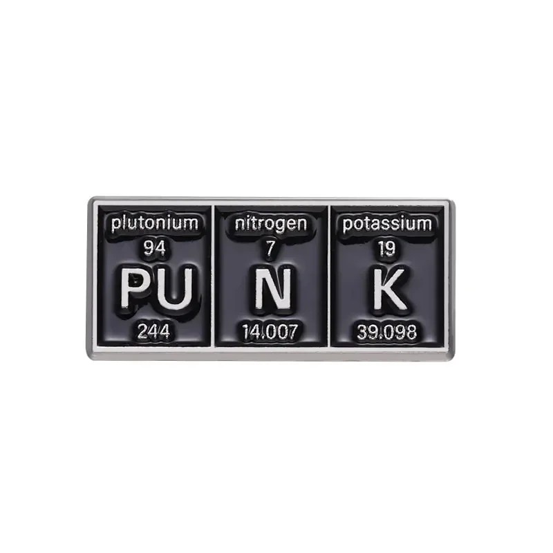 Tato chemická brož spojuje motiv periodické tabulky s výrazným nápisem PUNK vytvořeným z prvků Pu, N a K. Design vychází z typického zobrazení chemických prvků, včetně jejich symbolů a čísel, což dodává odznaku autentický vzhled. Díky tomuto provedení se jedná o zajímavý doplněk pro každodenní nošení i tematické outfity.