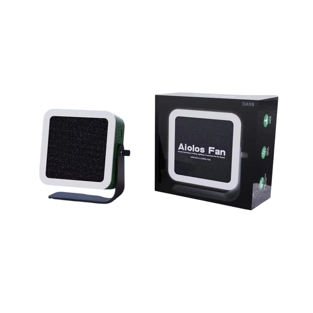 Ventilátor má rozměry 110 × 110 × 38 mm, takže nezabírá mnoho místa na pracovním stole. Vestavěná baterie o napětí 3,7 V a kapacitě 1200 mAh poskytuje dostatečný výkon pro běžné použití. Zařízení nabízí kombinaci chlazení, osvětlení a odsávání, což z něj činí praktický doplněk pro technické práce. Otočný stojan umožňuje nastavení směru proudění vzduchu podle potřeby.