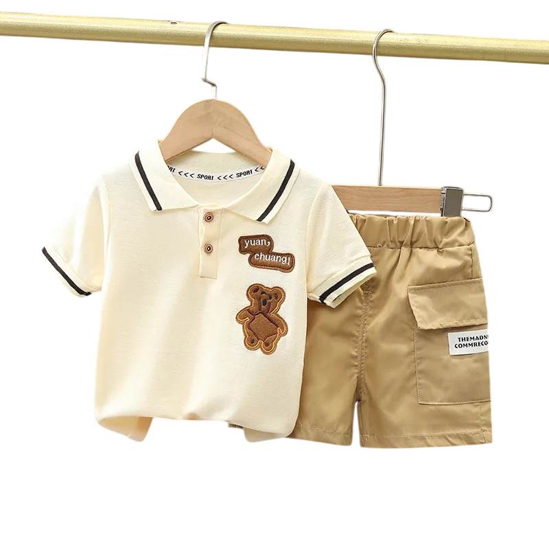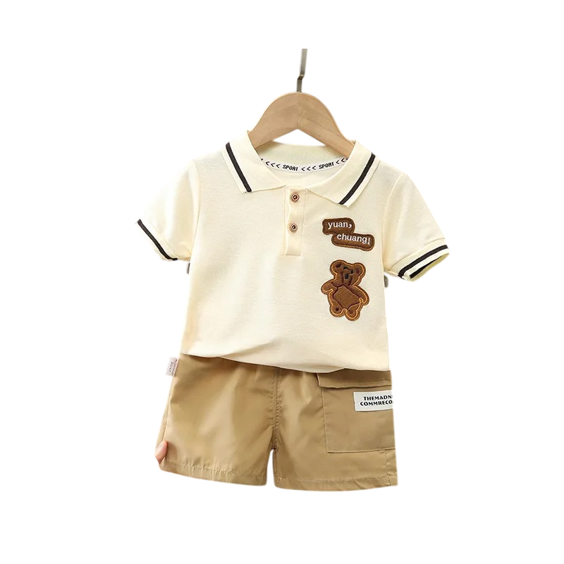 Chlapecká souprava polo tričko s medvídkem a béžové kraťasy na gumu s kapsami V výstřih s límečkem a knoflíky