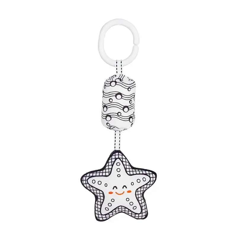 Toto černo-bílé chrastítko do kočárku s motivem mořské hvězdice je ideální doplněk pro nejmenší děti, které právě objevují svět. Kombinace kontrastních barev podporuje rozvoj zraku a smyslového vnímání už od prvních měsíců života. Díky měkkému a bezpečnému materiálu je hračka příjemná na dotek a vhodná i pro velmi malé děti. Praktické zavěšení umožňuje snadné uchycení ke kočárku, autosedačce nebo dětské postýlce, aby měla hračka miminko neustále zabavené.