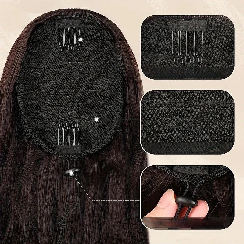Uchycení je řešeno pomocí integrovaného hřebínku a nastavitelné šňůrky, což zajišťuje stabilní držení během nošení. Vnitřní síťovaná struktura umožňuje lepší přizpůsobení a pohodlné usazení na vlastních vlasech. Vlnité provedení působí přirozeně a pomáhá vytvořit plnější a upravený culík bez složitého tvarování.