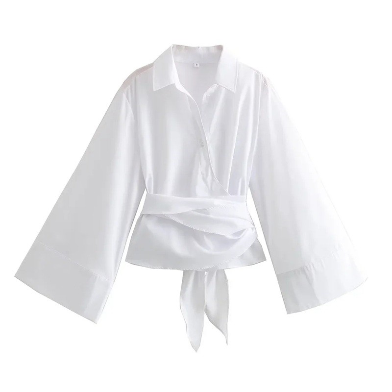 Dámská halenka s dlouhým rukávem a širokými manžetami Zavinovací střih Samosvazovací pásek Elegantní top pro každodenní i formální styl