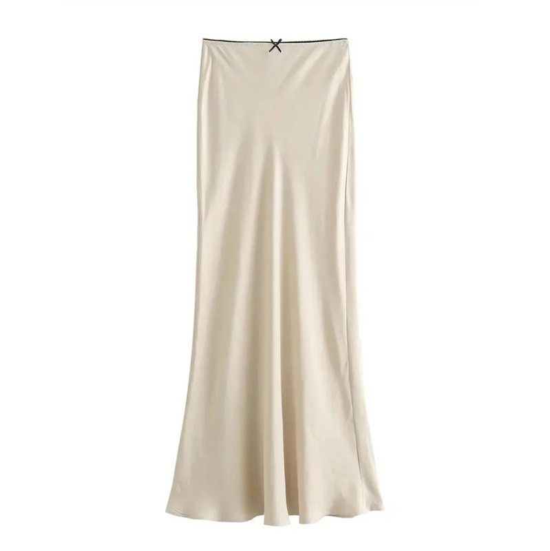 Elegantní široká sukně s mašlí a vysokým pasem z jemného saténu, ideální na letní dny, společenské události i volný čas. Celý popis