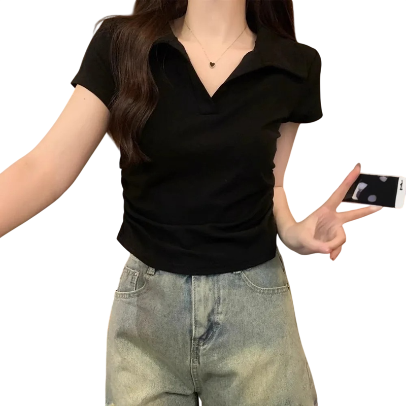 Dámská polokošile crop top Výstřih do V s límečkem Jednobarevné bavlněné tričko Krátký moderní střih pro ženy