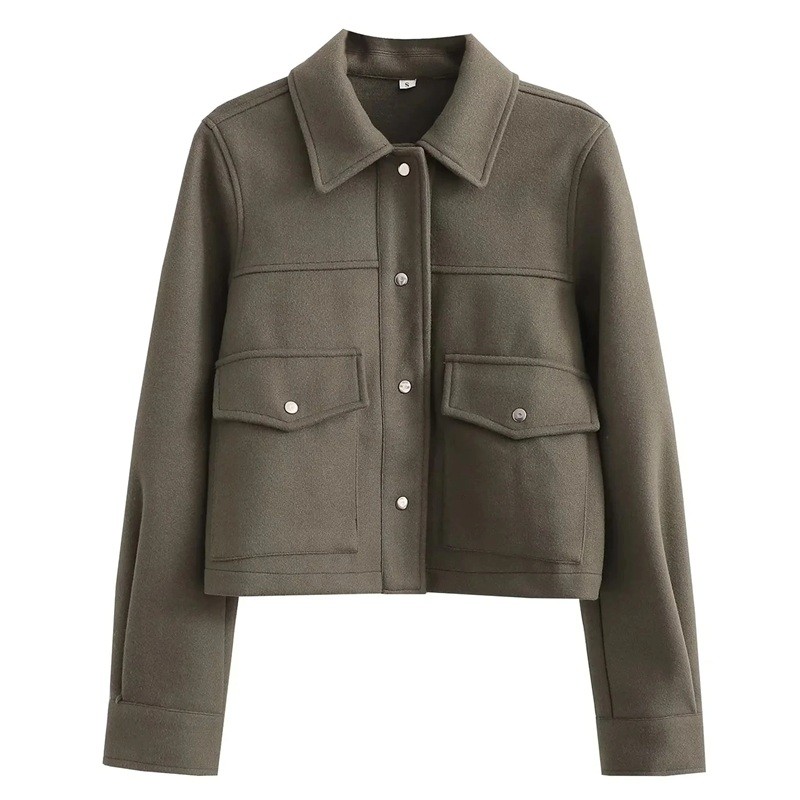 Dámská přechodová bunda se zapínáním na druky Stylová bunda do pasu s límcem Elegantní kabát s kapsami Jarní a podzimní sako