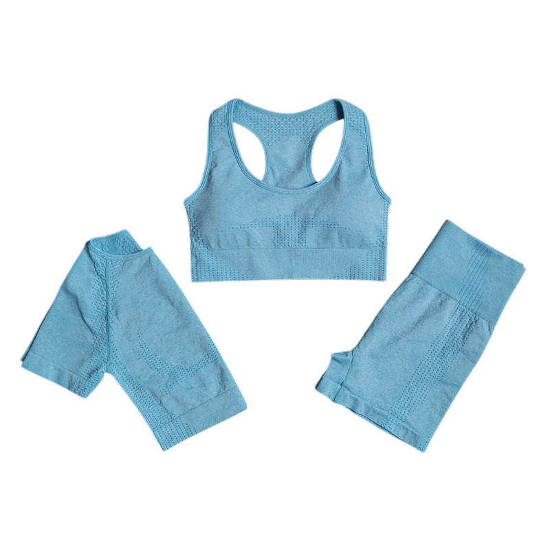 Tato dámská sportovní souprava je navržena jako praktický a funkční set pro aktivní ženy, které chtějí mít kompletní outfit pro sport i volný čas. Kombinace kraťasů, sportovní podprsenky a trička s krátkým rukávem poskytuje maximální pohodlí, volnost pohybu a moderní sportovní vzhled. Materiál složený z nylonu, polyesteru a spandexu je lehký, pružný a velmi příjemný na dotek. Jednobarevné provedení působí nadčasově a snadno se kombinuje s dalšími sportovními doplňky.