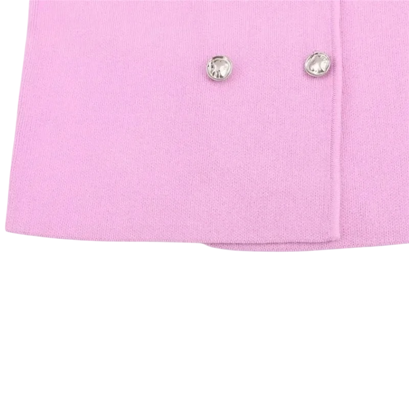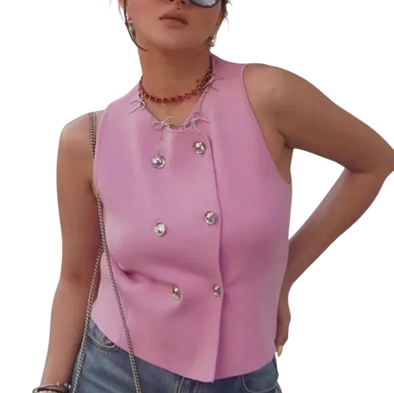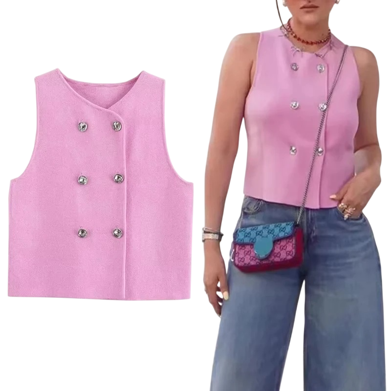 Krátká růžová vesta s dvojřadými knoflíky bez rukávů. Jednoduchý střih vhodný pro vrstvení i doplnění každodenních outfitů. Celý popis