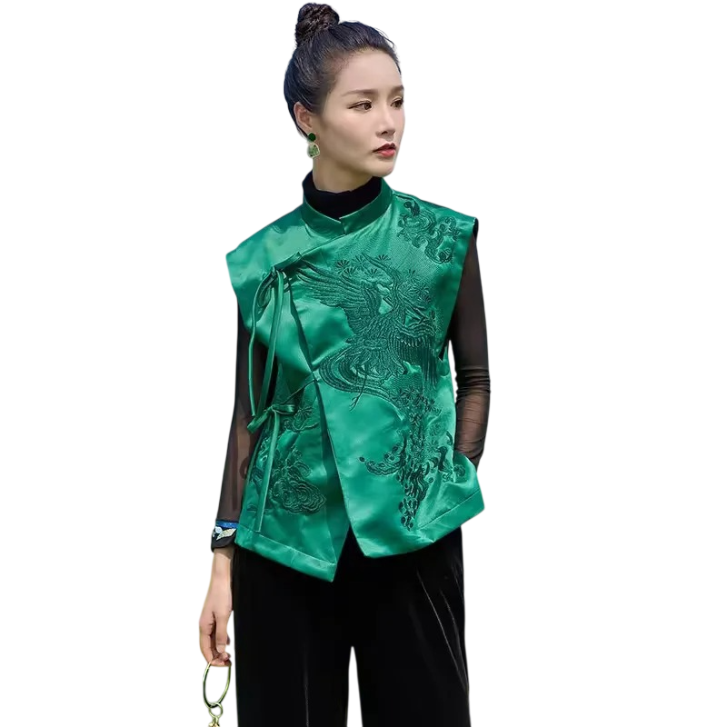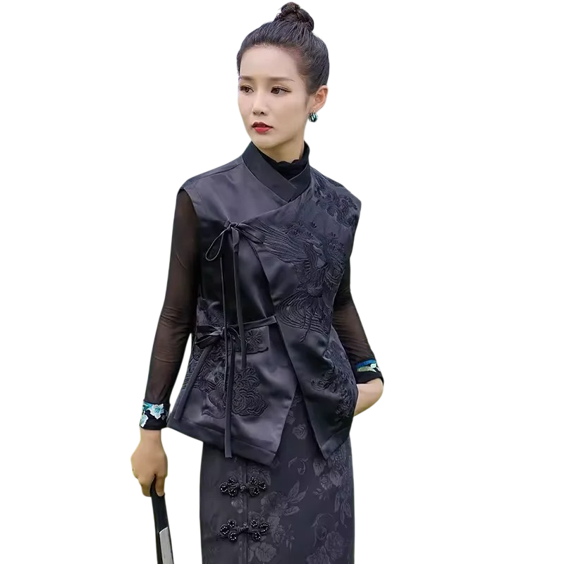 Dámská vesta s výšivkou a zavazováním na boku bez rukávů polyester elegantní střih pro společenské nošení i stylové vrstvení