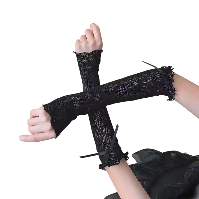 Lehké krajkové rukavice bez prstů s mašličkami, prodyšné a průhledné. Stylový doplněk vhodný pro společenské i tematické outfity. Celý popis