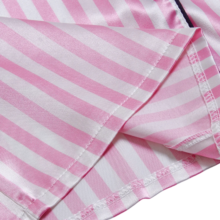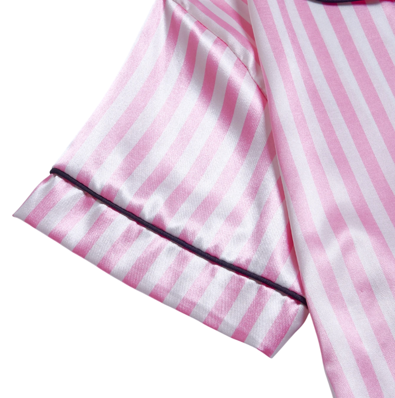 Tento pyžamový komplet je perfektní volbou pro ženy, které hledají kombinaci komfortu, stylu a kvality. Díky modernímu proužkovanému designu působí pyžamo svěže a elegantně, zatímco měkký a pružný materiál zajišťuje pohodlí během celé noci. Výšivka na kapsičce dodává pyžamu osobitý detail, který podtrhuje ženskost a smysl pro styl. Pyžamo se snadno udržuje, rychle schne a je odolné vůči opotřebení. Tento komplet se stane oblíbeným kouskem ve vašem šatníku – ideální pro klidný spánek i příjemné chvíle odpočinku.