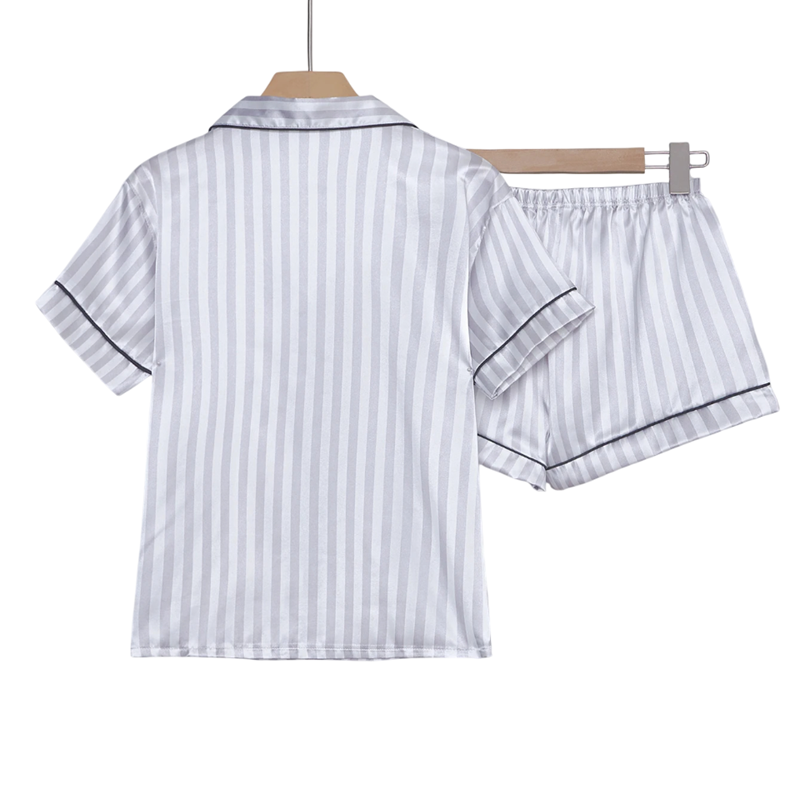Horní díl tvoří košile s krátkým rukávem a zapínáním na knoflíky, která dodává pyžamu klasický a elegantní vzhled. Na prsou se nachází malá kapsička s decentní výšivkou ve tvaru písmene V, která celý komplet ozvláštňuje. Kraťasy s elastickým pasem poskytují maximální komfort a svobodu pohybu. Pyžamo je dostupné v různých barevných variantách, které podtrhnou osobní styl každé ženy.
