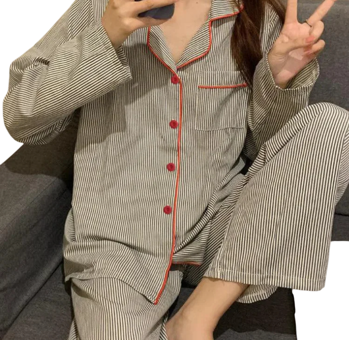 Košile s dlouhým rukávem a zapínáním na knoflíky působí klasicky a nadčasově. Oranžové lemování dodává celému kompletu stylový kontrast a jemný barevný akcent. Kalhoty s volnějším střihem perfektně doplňují horní díl a zajišťují volnost pohybu. Tento pyžamový komplet je ideální pro ženy, které chtějí vypadat dobře i během relaxace a zároveň se cítit pohodlně.