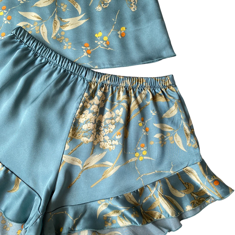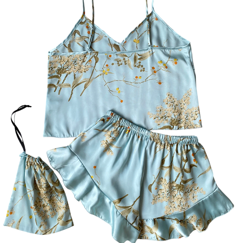 Horní díl tvoří tílko s kulatým výstřihem, které poskytuje maximální volnost pohybu a přirozené pohodlí. Kraťasy s elastickým pasem dokonale ladí s horním dílem a přinášejí pocit lehkosti a uvolnění. Květinový motiv dodává celému kompletu romantický a elegantní vzhled, který podtrhuje ženskost a vkus. K dispozici je několik barevných variant, díky nimž si každá žena může vybrat ten pravý styl pro sebe.