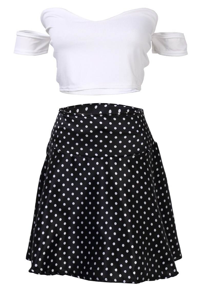 Roztomilé dvoudílné šaty - mini sukně se zvýšeným pasem + top se spadlými rukávy.