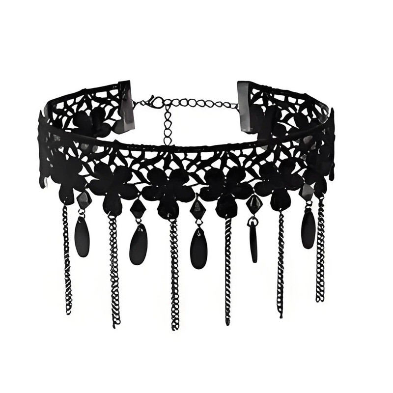 Krajkové zpracování působí jemně, zatímco kombinace s kovovými prvky přináší kontrast a vizuální výraznost. Dámský choker díky svému provedení zvýrazňuje oblast krku a přitahuje pozornost na první pohled. Dekorativní řetízky se při pohybu lehce pohupují a vytvářejí dynamický efekt.