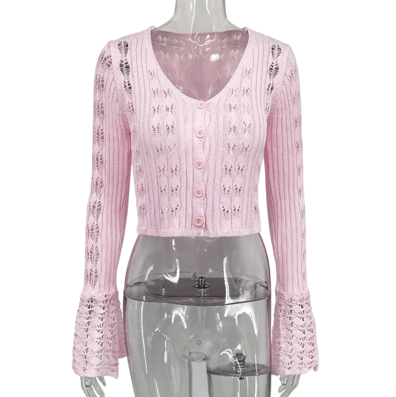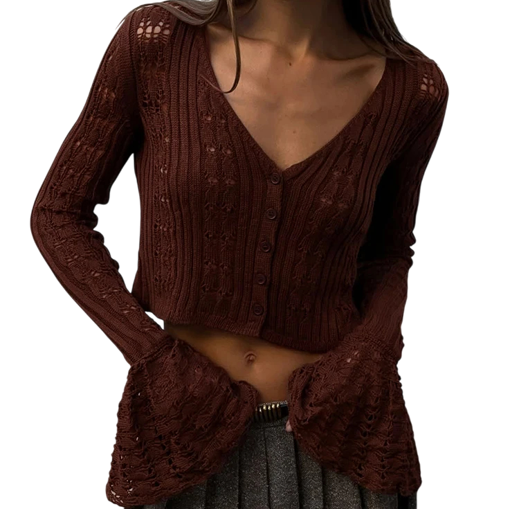 Elegantní dámský kardigan s výstřihem do V, zapínáním na knoflíky a rozšířenými rukávy. Pohodlný a stylový. Vhodný pro každodenní nošení. Celý popis