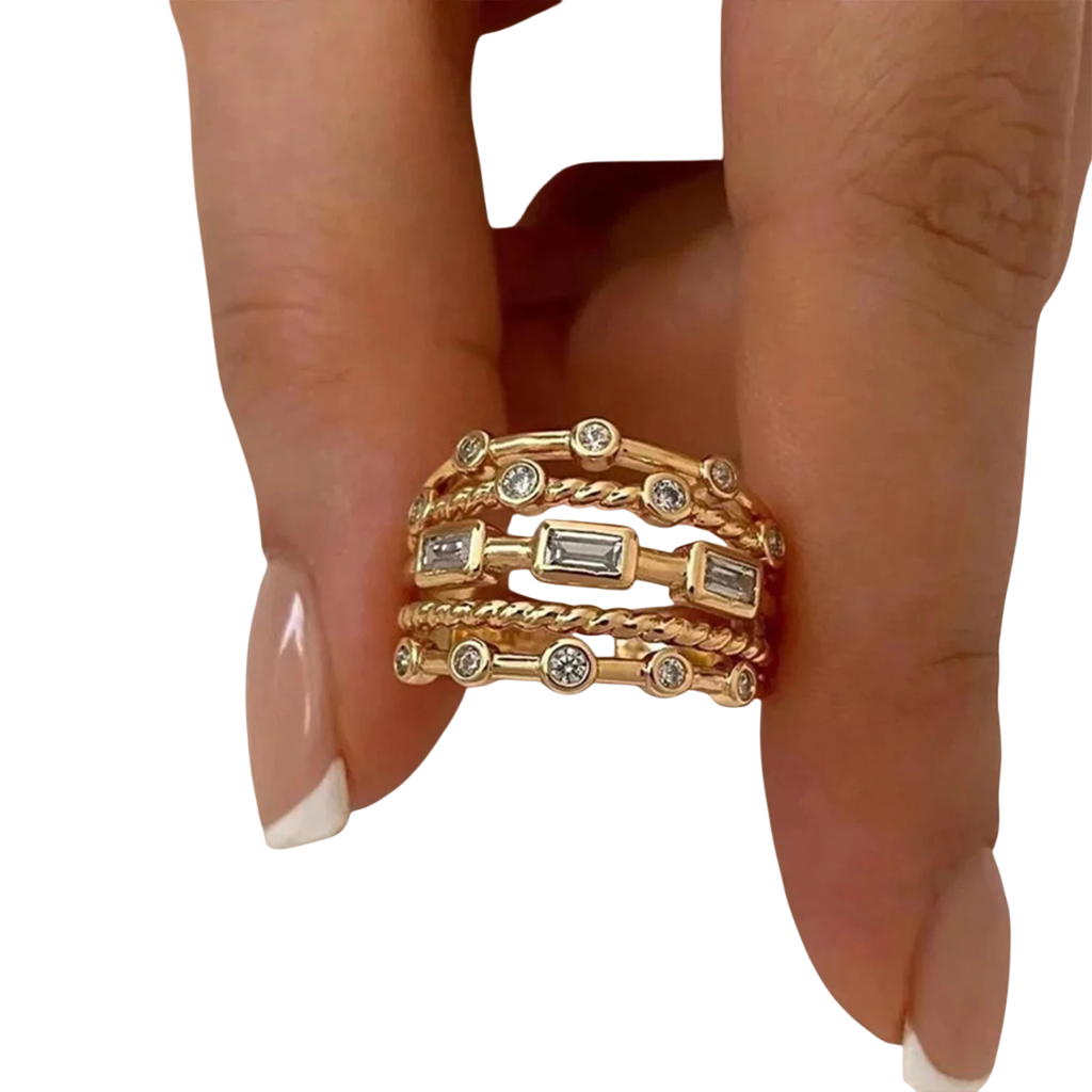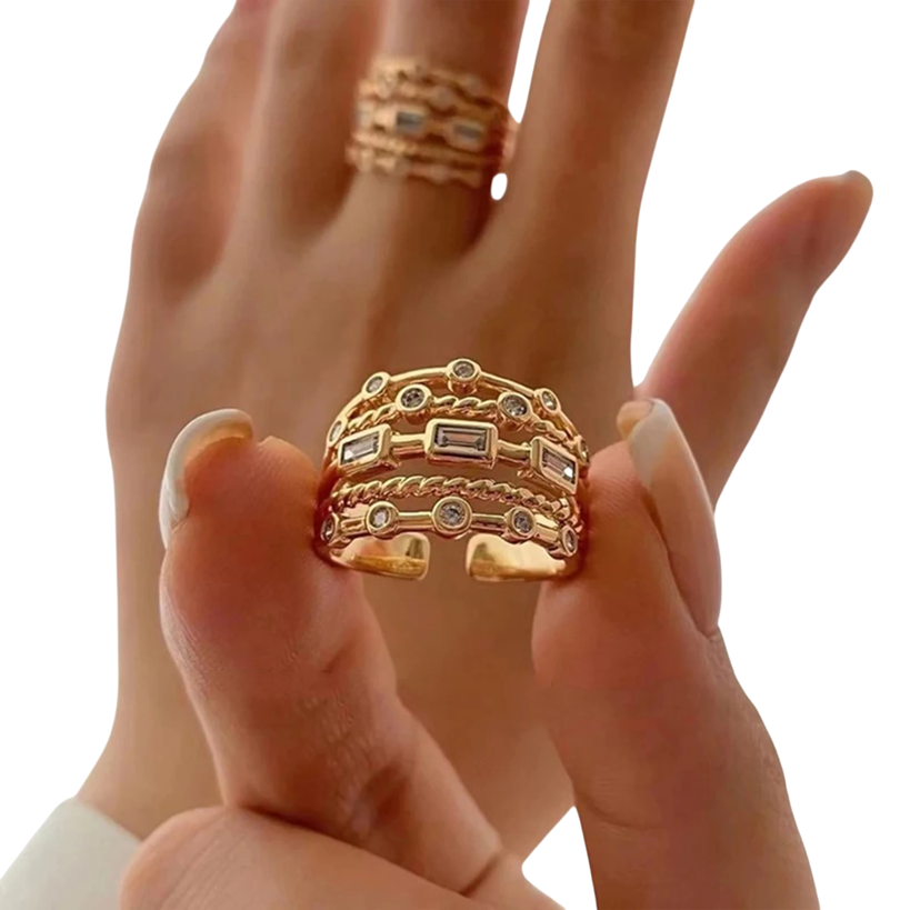 Stylový víceřadý prsten s nastavitelnou velikostí zdobený jemnými texturami a třpytivými kamínky, ideální doplněk pro každodenní i slavnostní nošení. Celý popis