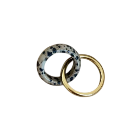 Tento prsten zaujme svým originálním dvojitým kruhovým designem, který vytváří výrazný a moderní vzhled. Konstrukce je tvořena dvěma propojenými kruhovými částmi, díky čemuž působí šperk výrazně a dekorativně. V horní části je umístěn kulatý dekorativní kamínek, který je hlavním vizuálním prvkem prstenu.