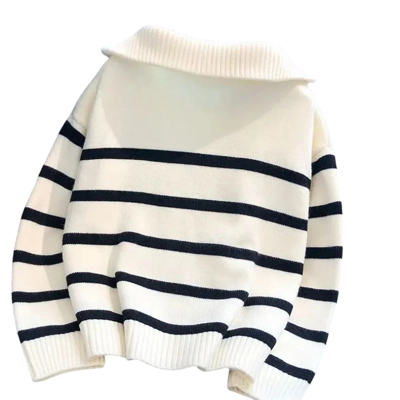 Stylový dámský svetr s výstřihem do V a zipem. Pruhovaný design v bílé a černé barvě, pohodlný acetátový materiál, ideální pro elegantní outfit. Celý popis
