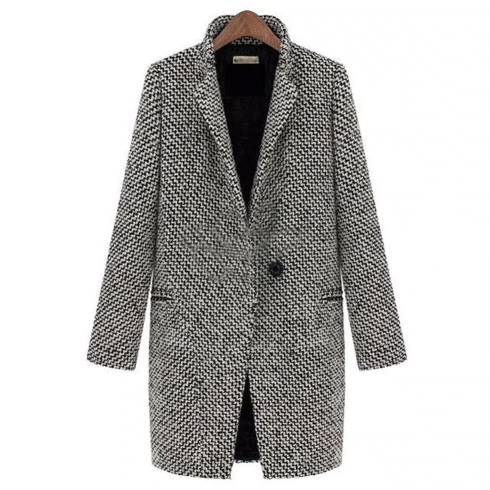 Kabát je vlněný a je v šedé barvě.