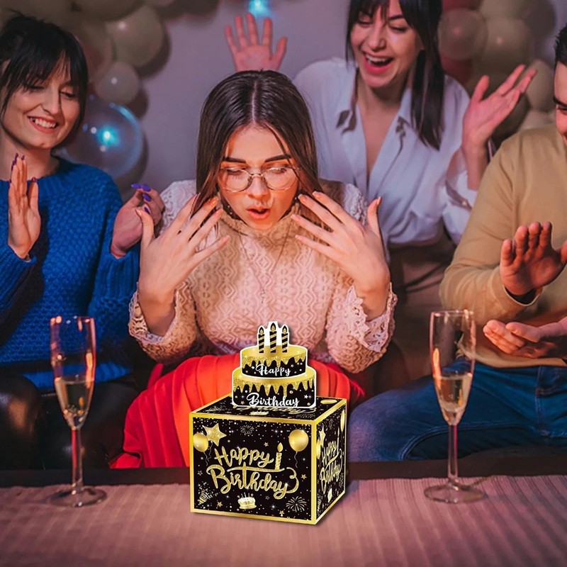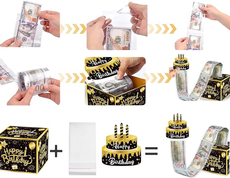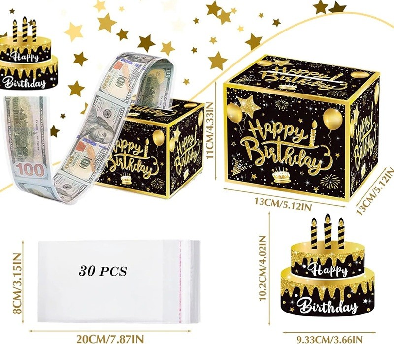 Dárková krabička na peníze s výsuvným překvapením, 13 × 13 × 11 cm + dortová dekorace 10 cm Tato originální dárková krabička představuje zábavný a překvapivý způsob, jak darovat peníze. Po otevření se z krabičky vysouvá dlouhý pás s průhlednými kapsami, do kterých lze vložit bankovky nebo drobné vzkazy. Na vrchní části je umístěna dekorace ve tvaru narozeninového dortu, která po vytažení vytvoří efektní „wow“ moment. Krabička tak není jen obalem, ale součástí samotného zážitku z darování.