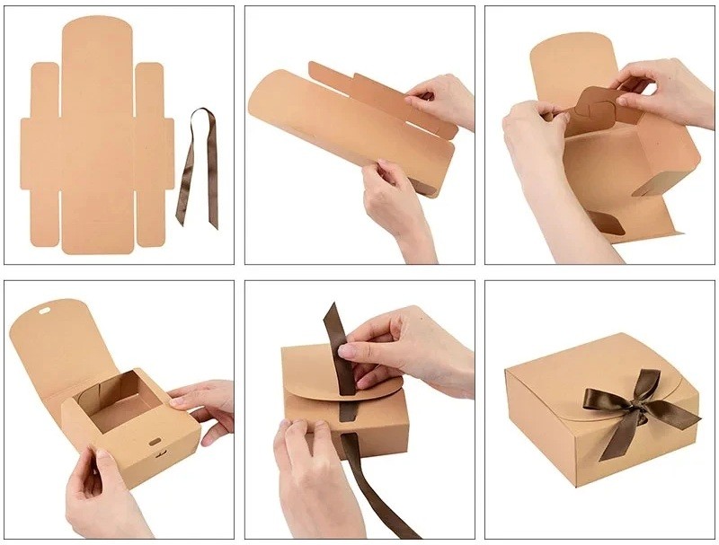 Složení krabičky je intuitivní a zvládnete jej během několika kroků. Přehnutím předem připravených částí vytvoříte pevný tvar krabičky, jednotlivé díly do sebe zapadnou bez potřeby lepidla. Po naplnění stačí zavřít víko a krabičku zajistit přiloženou stuhou. Celý proces je rychlý a vhodný i pro balení více dárků najednou.